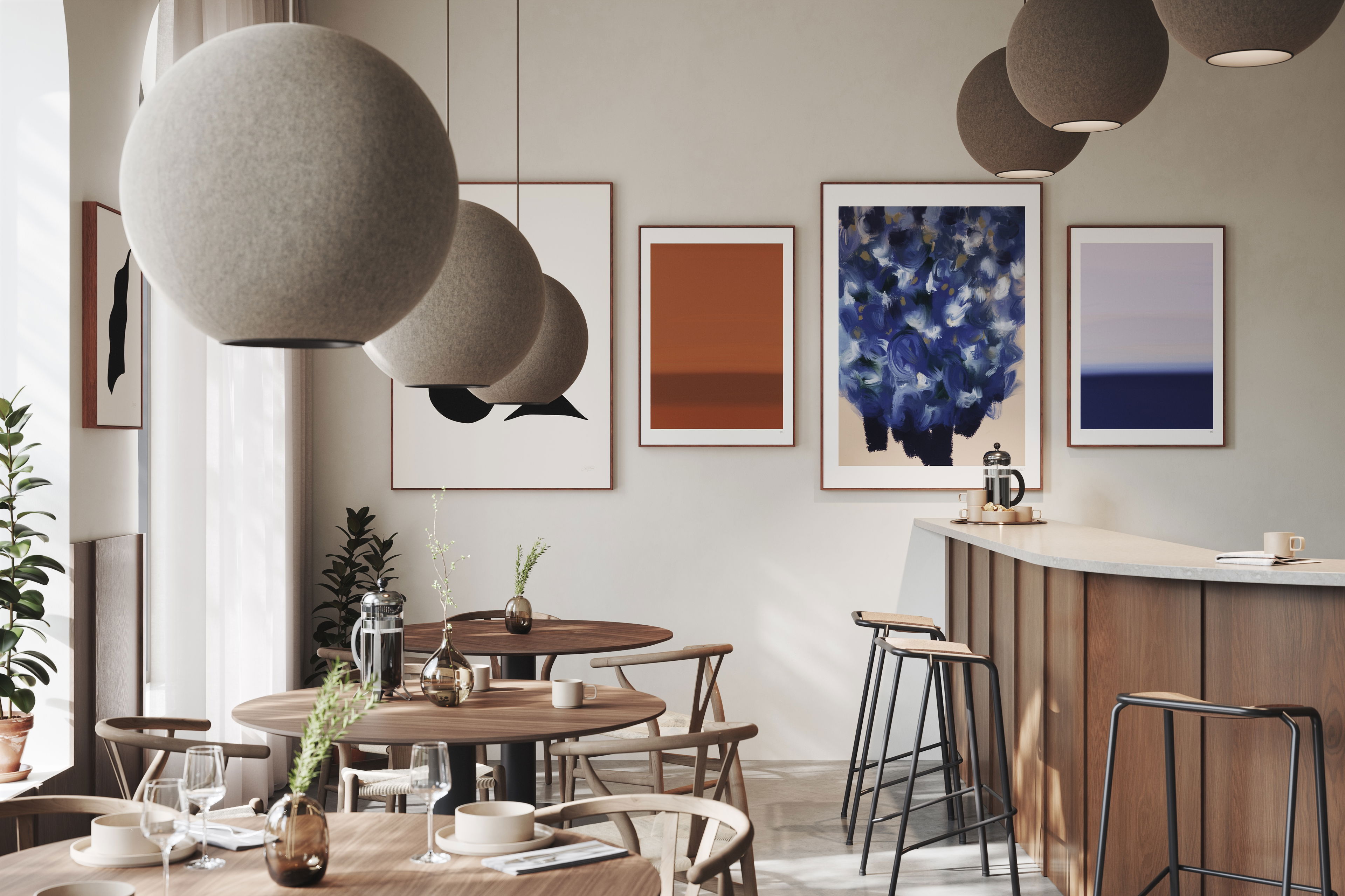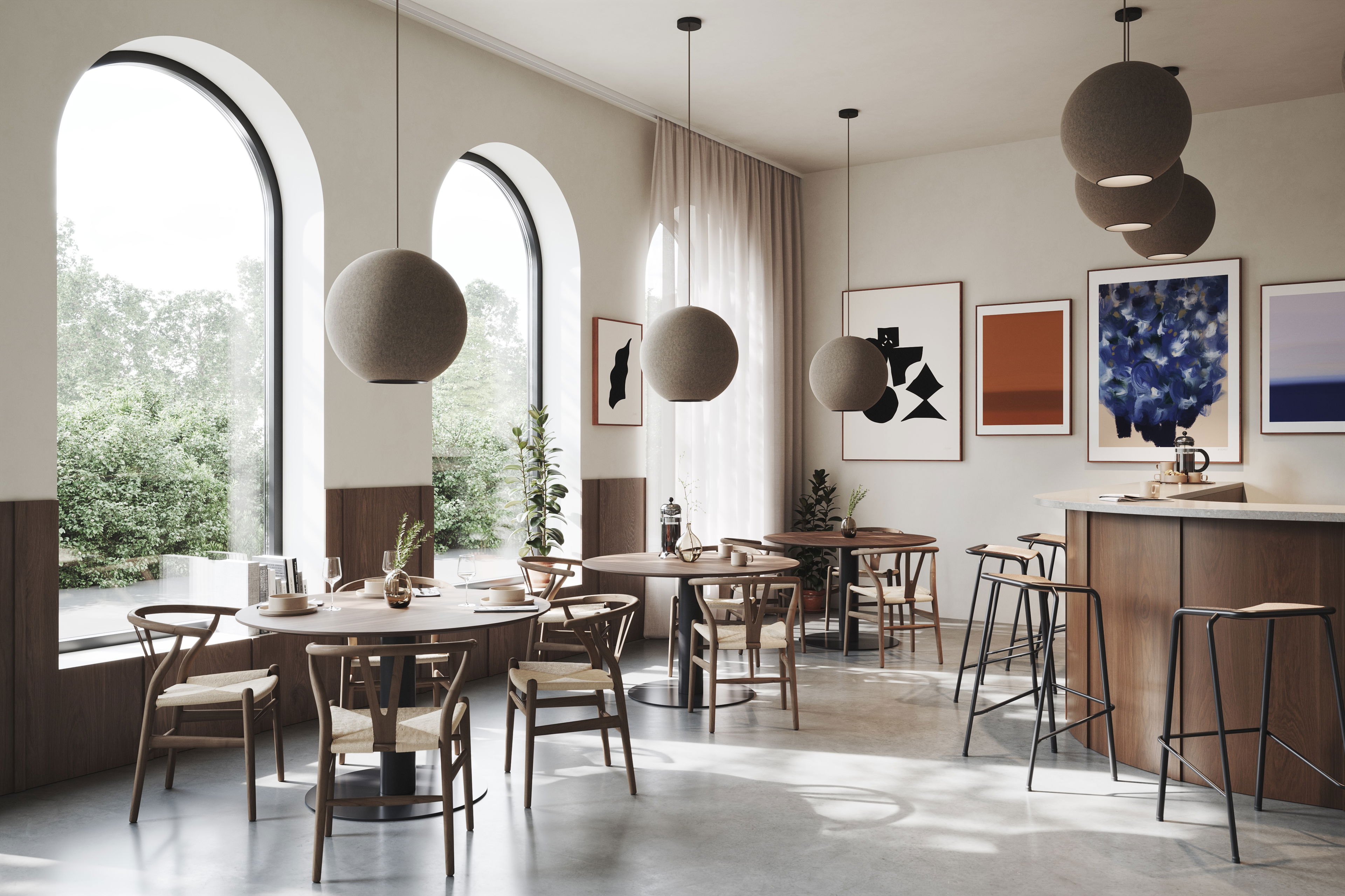 Ett stilfullt café som visar hur Abstractas ljudabsorbenter kan integreras i offentliga miljöer.